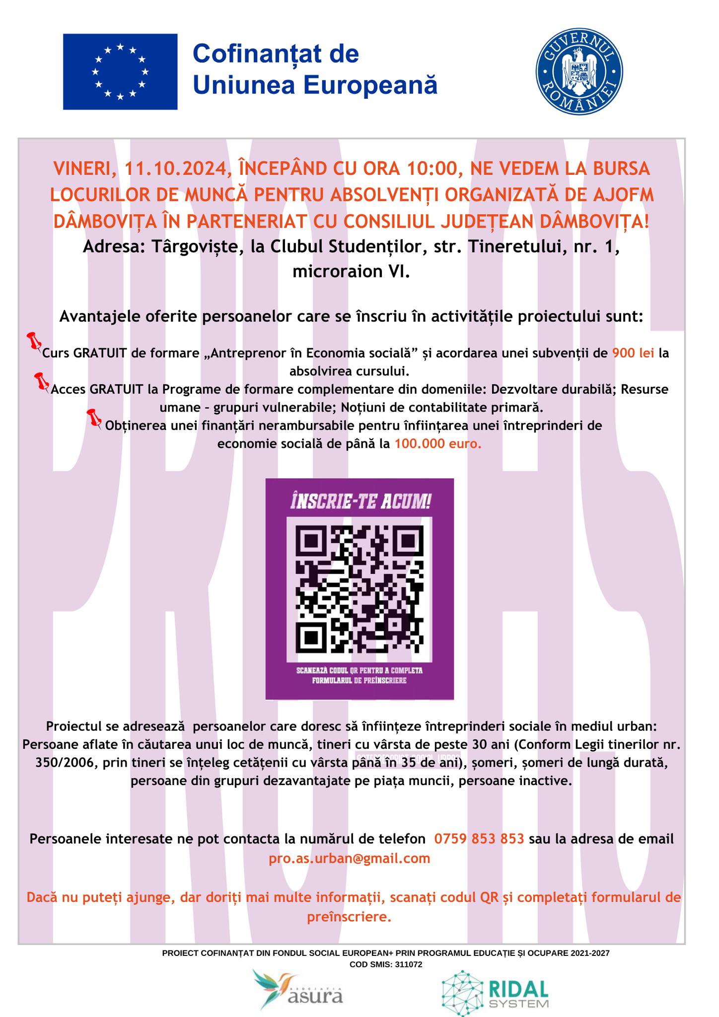 Vom participa la bursa locurilor de muncă organizată de AJOFM, unde avem oportunitatea de a prezenta proiectul nostru dedicat înființării de întreprinderi sociale și creării de locuri de muncă. Această participare ne va permite să interacționăm cu potențiali angajatori și să împărtășim viziunea noastră despre impactul pozitiv al întreprinderilor sociale asupra comunității. Suntem pregătiți să discutăm despre beneficiile proiectului nostru și despre cum putem contribui împreună la dezvoltarea unui mediu de muncă sustenabil.